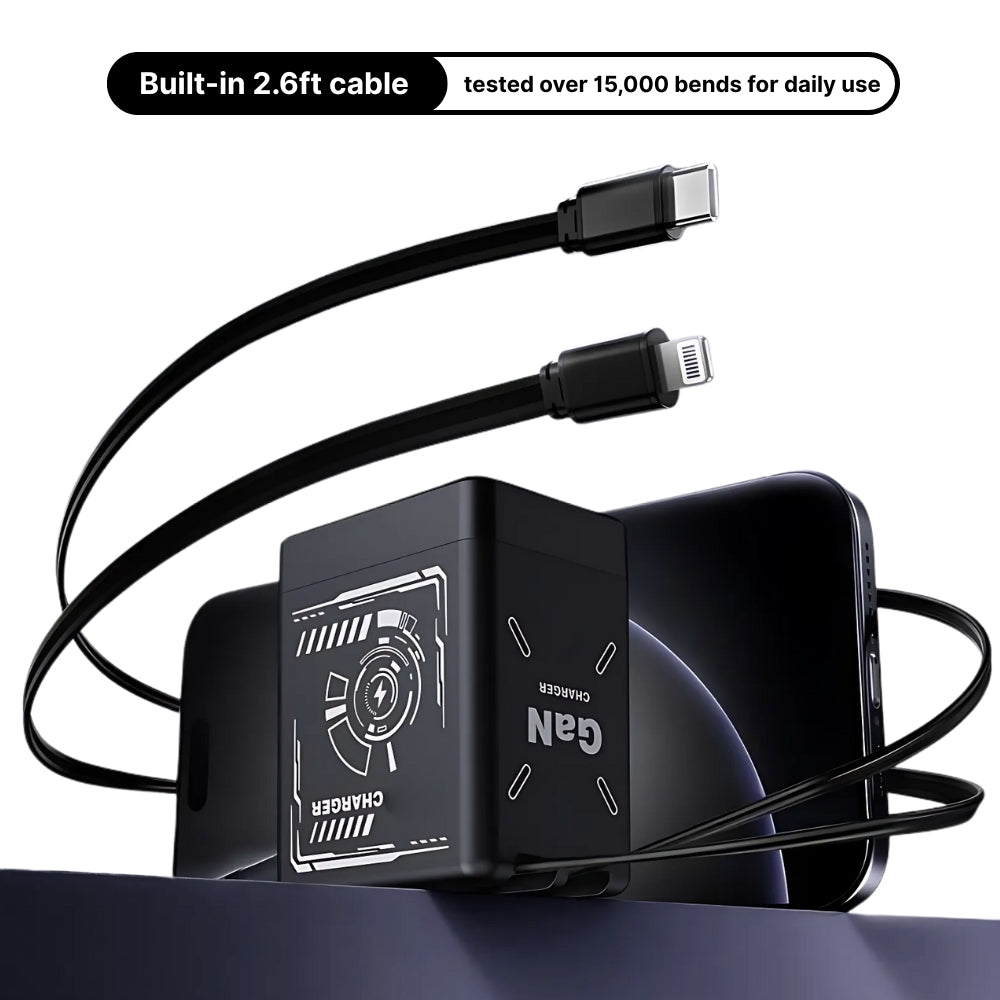 Includes two integrated, retractable cables (USB-C + Lightning), built to handle 20,000+ pulls. They snap back into place smoothly — for fast, tidy, always-there charging.